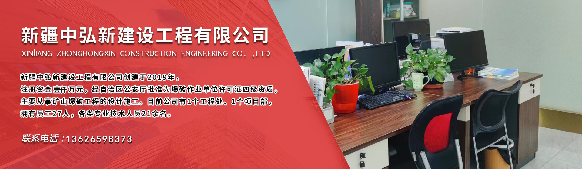 ZHONGHONGXIN CONSTRUCTION ENGINEERING 公 司 簡 介新疆中弘新建設工程有限公司創(chuàng)建于2019年,注冊資金壹仟萬元,經自治區公安廳批準為爆破作業單位許可證四級資質,主要從事礦山爆破工程的設計施工、礦上采掘施工業務。目前公司有1個工程處、2個項目部,分...